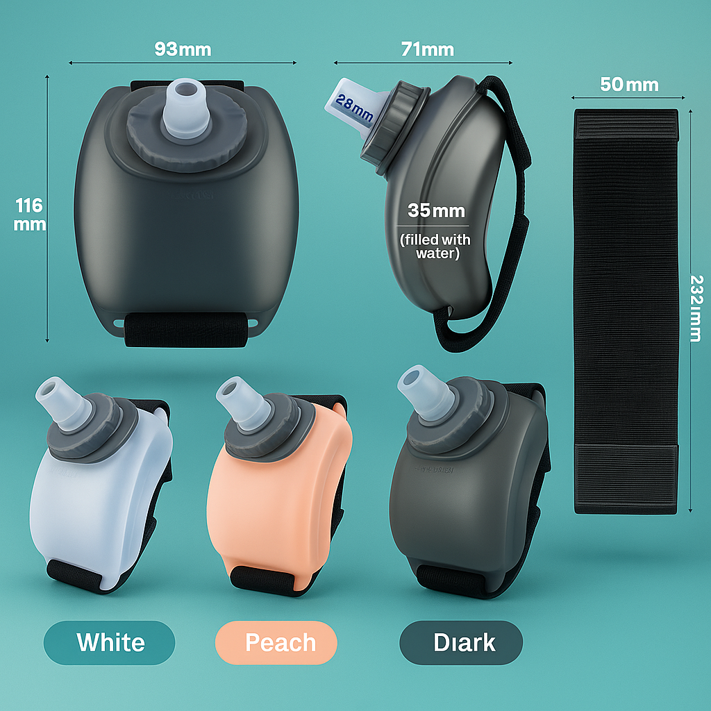 Each SipBand™ holds 200ml (7 fl oz) of water and weighs just 60g, making it ultra-light and easy to wear.